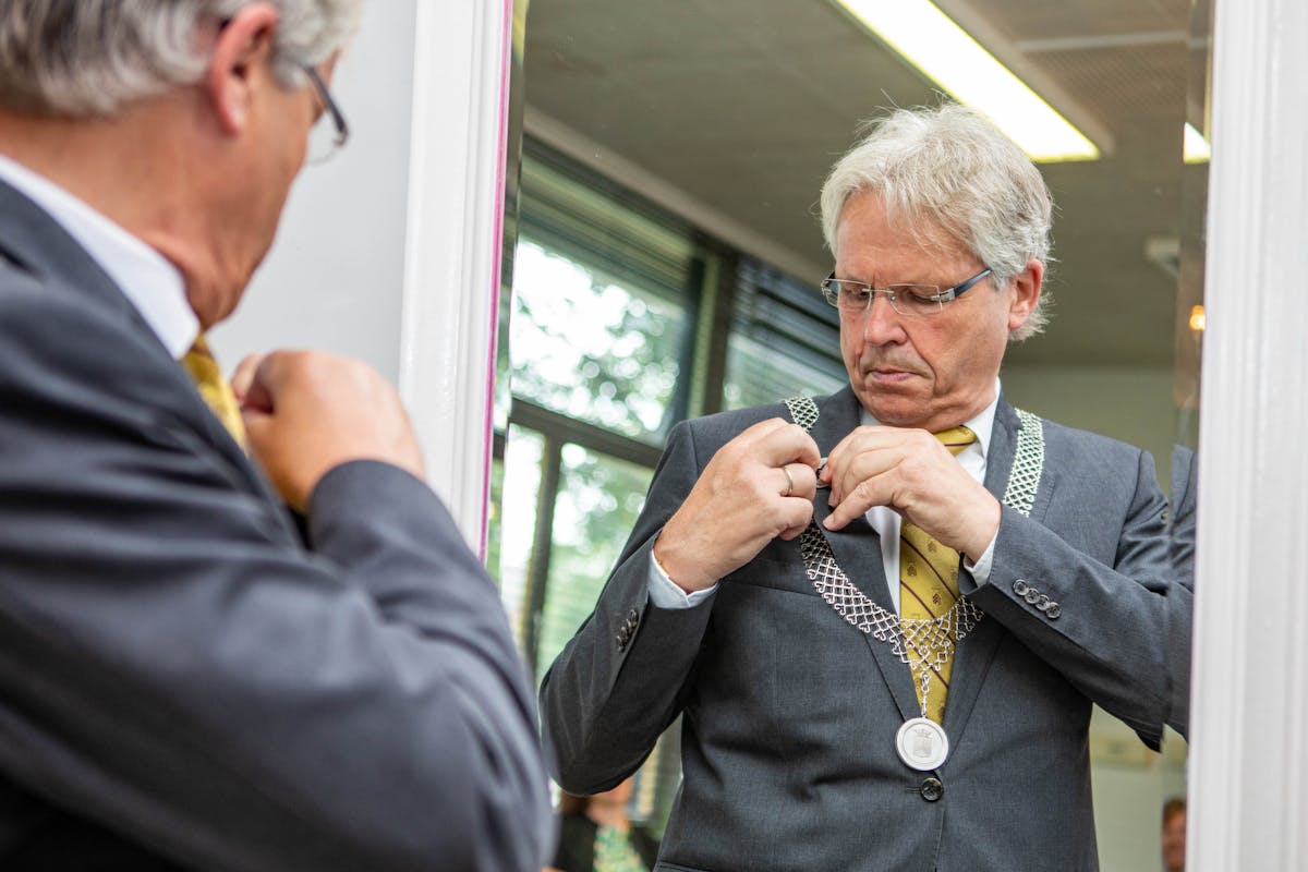 Uit de zaal klinkt applaus, de burgemeester ontvangt de penning. Er staat een grote spiegel klaar zodat de burgemeester de penning bij zichzelf kan opspelden. Dat heeft wat voeten in aarde, maar na een aantal minuten prijkt de penning dan toch op zijn revers.