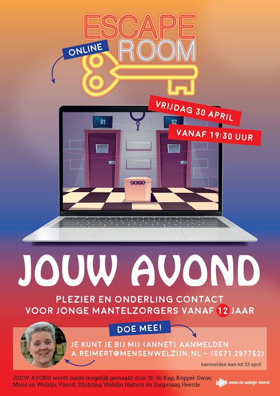 Op vrijdag 30 april ligt er weer een ‘JOUW AVOND’ in verschiet voor jonge mantelzorgers (vanaf 12 jaar) uit de regio. Deze keer spreken we af in een online escaperoom waaruit we natuurlijk proberen te ontsnappen!