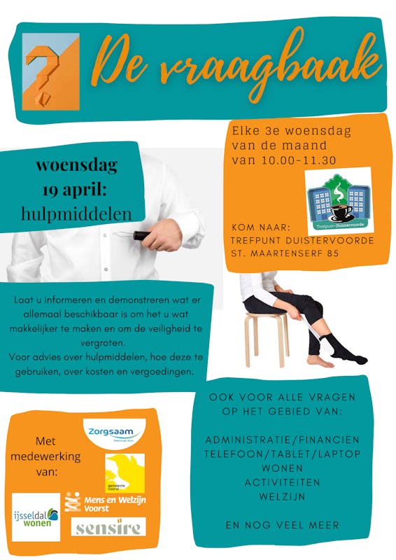 Om een indruk te krijgen van wat er allemaal beschikbaar is kunt u op woensdag 19 april langskomen bij de Vraagbaak in Trefpunt Duistervoorde. Deze maandelijkse inloop voor informatie en hulp staat deze maand in het teken van hulpmiddelen. Naast het vaste team van Mens en Welzijn Voorst en IJsseldal Wonen staan ook verschillende deskundigen op het gebied van hulpmiddelen voor u klaar.