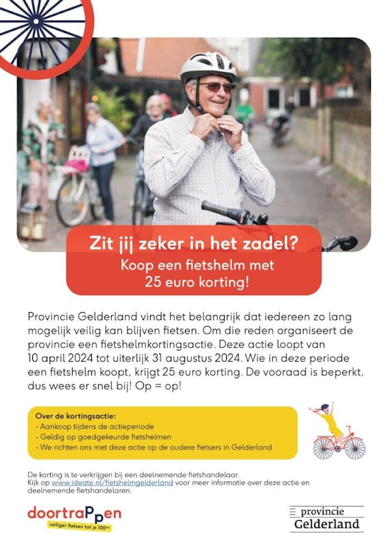 De fietshelmkortingsactie wordt uitgevoerd vanuit het programma ‘Doortrappen’, in opdracht van provincie Gelderland. Deze kortingsactie geldt voor de gehele provincie. Meer informatie over alle lokale ‘Doortrap-activiteiten’ is verkrijgen via Guus Kroes: of 06-40103611.