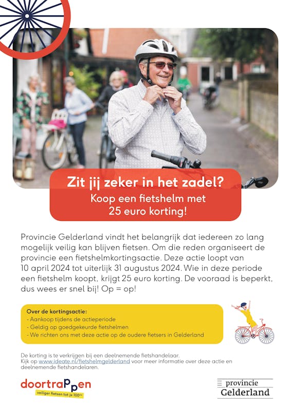 De fietshelmkortingsactie wordt uitgevoerd vanuit het programma ‘Doortrappen’, in opdracht van provincie Gelderland. Deze kortingsactie geldt voor de gehele provincie. Meer informatie over alle lokale ‘Doortrap-activiteiten’ is verkrijgen via Guus Kroes: of 06-40103611.