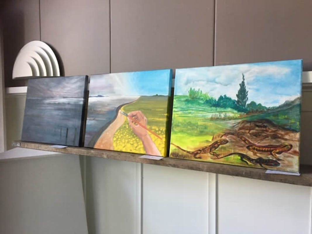 Bij de huidige expositie van de Buitenschilders (gestart begin maart, maar helaas terminaal voortijdig afgebroken) stonden die 7 paneeltjes eindeloos te wachten tot er tijdens de openingstijden van de galerie iets met ze zou gebeuren...