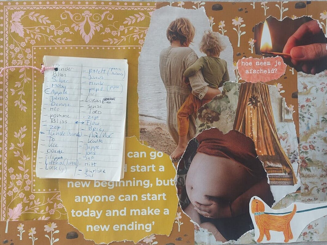 Iedereen heeft een voorwerp meegenomen dat hun dierbaar is of symbolische betekenis heeft. Een van deze vrouwen heeft een oud, gekoesterd opschrijfboekje meegenomen, gevuld met kindernamen die ze jarenlang verzamelde voor als ze later moeder zou zijn. Sommige namen zijn doorgestreept. Soms is de betekenis van de naam erbij geschreven. Ze vertelt dat ze al sinds jonge leeftijd moeder wilde worden en dat al haar mooiste kindernamen hierin staan. Halverwege het boekje houden de namen op. Namen voor kinderen die nooit kwamen. Met aandacht haalt ze enkele velletjes uit het boekje om te verwerken in haar collage.