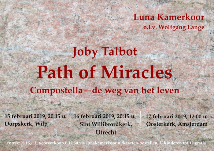 De veelzijdige Britse componist Joby Talbot (1971) kreeg in 2002 de opdracht van het Tenebrae Choir om voor haar 17 zangers een muziekstuk te schrijven gebaseerd op de Camino. Hij reisde met zijn gezin naar Spanje om de route te ervaren. Talbot: “…we visited many of the important points of the Camino including four of its greatest churches….. The impressions these places left on me became the basis for the musical structure of the work.” Path of Miracles bestaat uit vier delen gebaseerd op de vier grootste kerken langs de route in Roncesvalles, Burgos, Leon en Santiago.