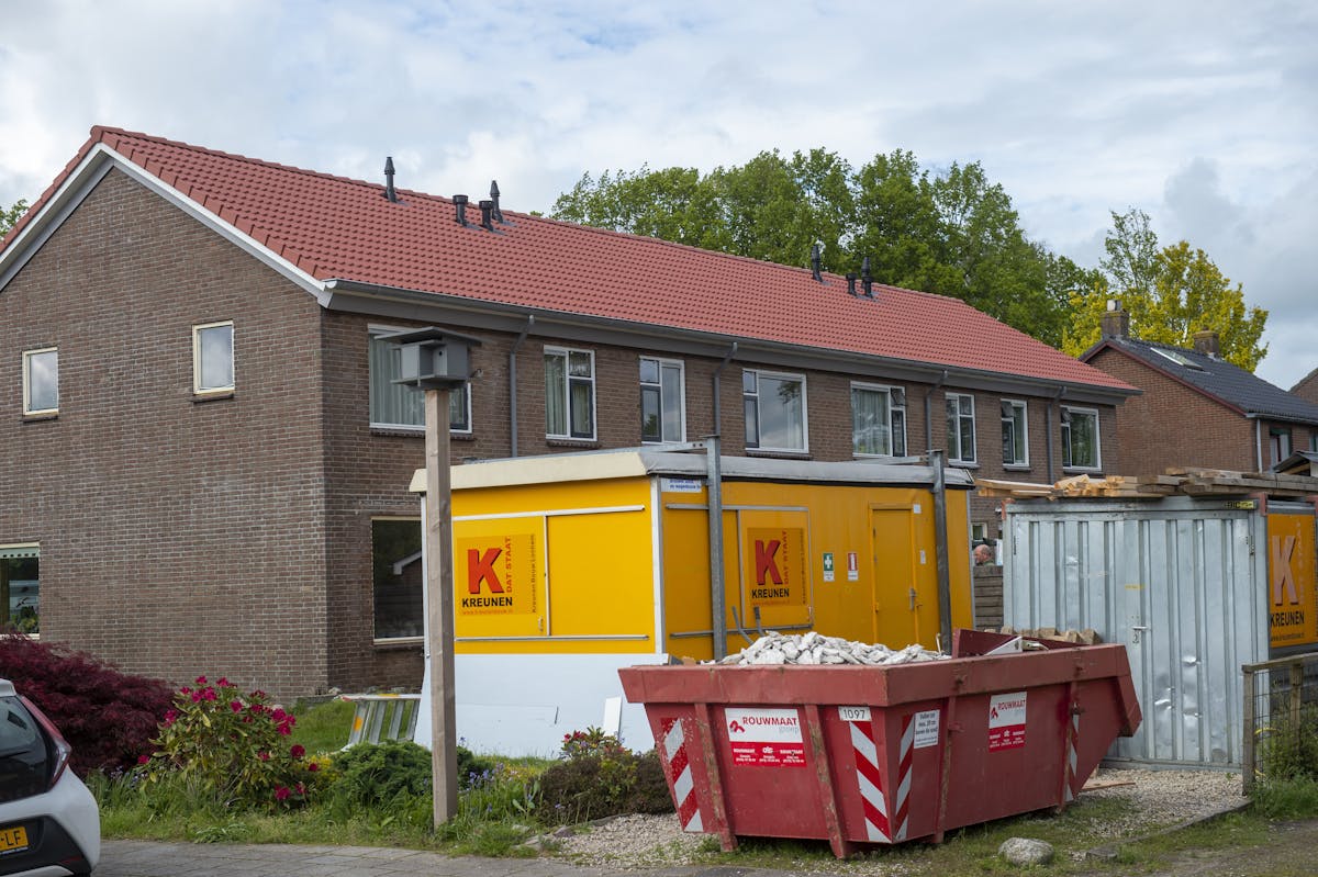 Vier woningen aan de Bleriotstraat in Teuge krijgen dit voorjaar een complete ‘make-over’. Daarmee wordt de levensduur van deze woningen uit 1960 verlengd. Gerard Jansen is één van de bewoners, hij woont er al ongeveer 16 jaar. “Ik zit op dit moment helemaal in de rotzooi, maar het wordt wel mooi!” Het hele dak van de woning is er af gehaald, met een grote kraan. “Daarin zat asbest verwerkt,” vertelt Gerard. Vervolgens kreeg de woning een nieuw geïsoleerd dak. “De kinderen van de basisschool hier tegenover vonden het erg spectaculair.” Gerard kon zijn spullen kwijt in een zeecontainer in de tuin. De buren hielpen elkaar om de zolders leeg te maken en overgebleven rommel in de container te gooien.