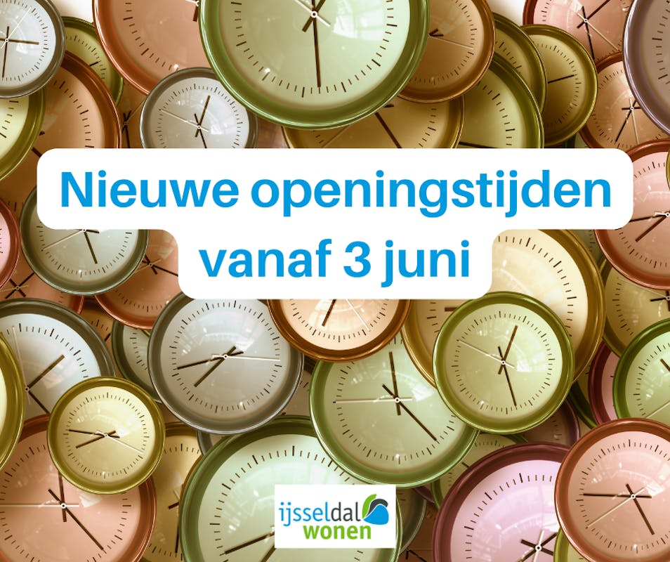 Vanaf maandag 3 juni 2024 gaat IJsseldal Wonen ’s middags op afspraak werken. Hierdoor hebben we meer tijd en aandacht om je persoonlijk te helpen. We zijn vanaf maandag 3 juni elke werkdag open voor bezoekers van 08.30 tot 12.00 uur. Het kantoor is ’s middags gesloten. Na 12.00 uur werken we alleen op afspraak. Dit kan op kantoor, bij jou thuis of in de wijk zijn. Wil je een afspraak maken? Neem dan contact op via (0571) 27 79 79 of . Op vrijdagmiddag zijn geen afspraken mogelijk.