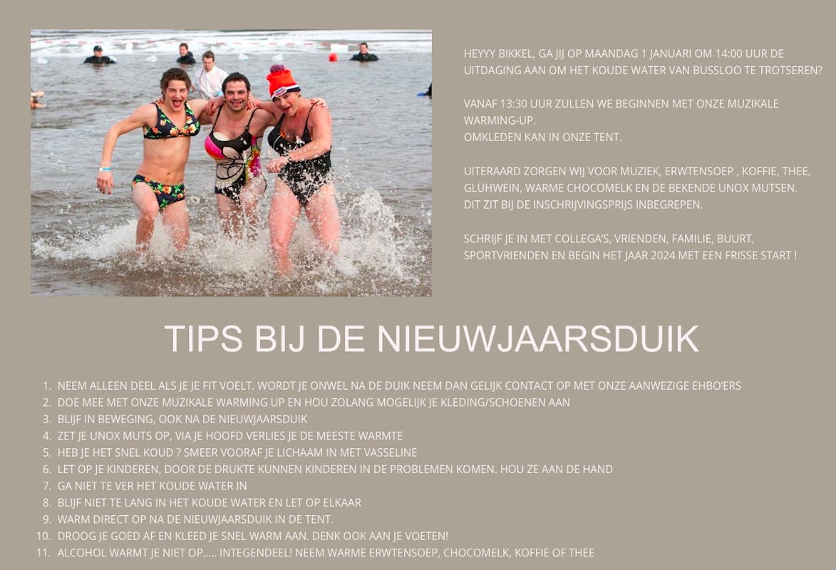 Schrijf je in op https://strandhuysenk.nl/nieuwjaarsduik-2024/HEYYY BIKKEL, GA JIJ OP MAANDAG 1 JANUARI OM 1400 UUR DE UITDAGING AAN OM HET KOUDE WATER VAN BUSSLOO TE TROTSEREN VANAF 1330 UUR ZULLEN WE BEGINNEN MET ONZE MUZIKALE WARMING-UP. OMKLEDEN KAN IN O.pdf