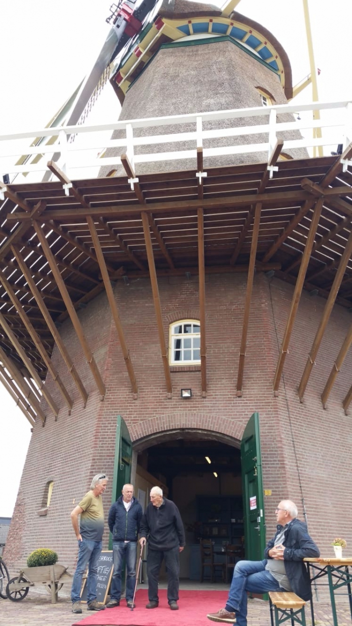 De molen die nog niet af is maar wel op dit soort dagen opengesteld wordt stond trots te pronken in het dorp. Onderstaande molenaars kletsen nog even na over de geslaagde dag.