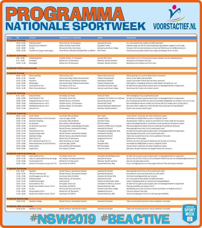 Wist jij dat ook in de gemeente Voorst - in de Nationale Sportweek, maar ook door het jaar heen - heel veel sportieve activiteiten zijn? Team Voorst Actief (de buurtsportcoaches en dorpscontactpersonen) hebben namens de gemeente een programma gemaakt met voornamelijk gratis toegankelijke activiteiten. Daarmee faciliteren en stimuleren ze de deelname aan sport- en beweegactiviteiten en de sociale ontmoetingen. Team Voorst Actief zoekt zoveel mogelijk de samenwerking met lokale organisaties en speelt in op vragen en initiatieven van inwoners van de gemeente Voorst.