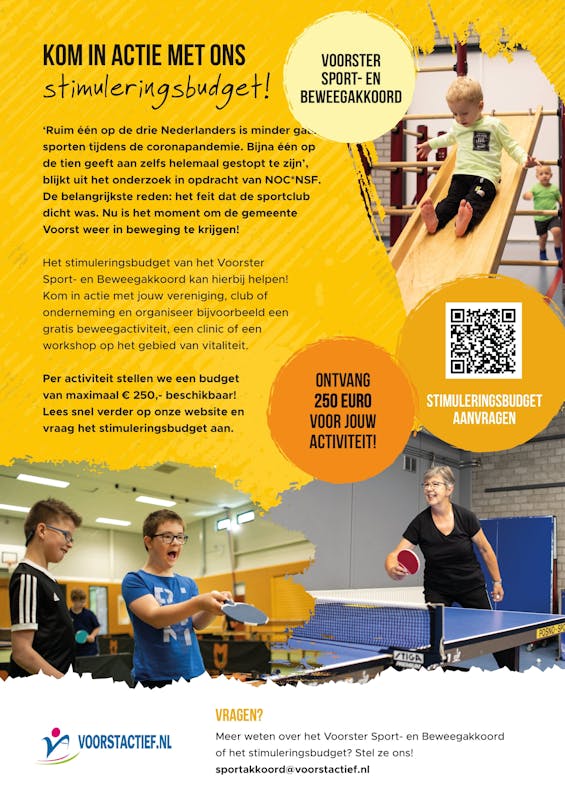 Dit jaar is het laatste jaar dat wij subsidie ontvangen voor de uitvoering van de acties uit het sport- en beweegakkoord. Wanneer uw vereniging de daad bij het woord wil voegen, is er budget beschikbaar. Hierbij maken we onderscheid tussen uitvoerings- en stimuleringsbudget. Over het laatstgenoemde budget gaat de advertentie in de bijlage. We leggen het verschil uit op onze website. Hier kunt u ook budget aanvragen.
