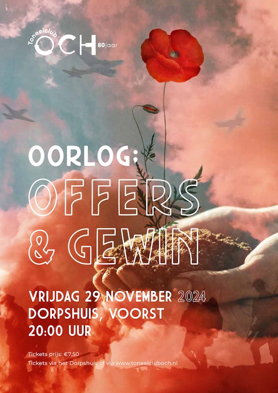Op vrijdag 29 november om 20.00 uur voert toneelclub O.C.H. uit Holten het stuk Oorlog; offers & gewin op in het Dorpshuis in Voorst. Dit meeslepende toneelstuk laat zien hoe oorlog levens verandert en zowel offers als onverwachte winsten met zich meebrengt.
