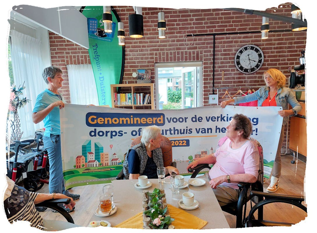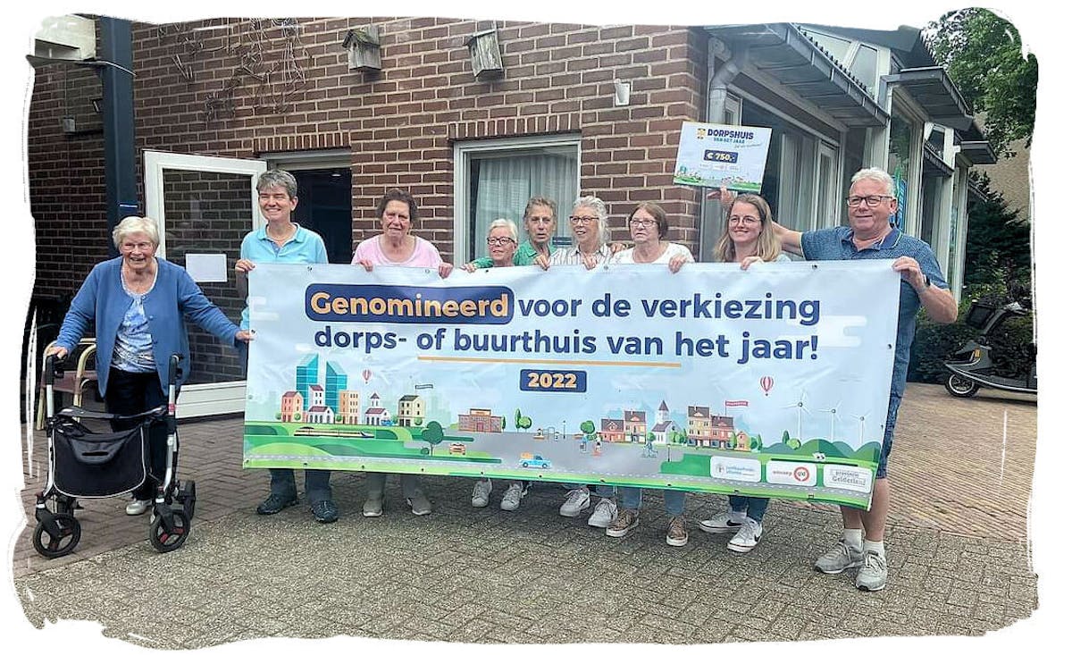 Beheerder Judit Koetsruiter komt als eerste binnen vallen. Ze krijgt een cheque in haar handen gedrukt van 750 euro, want Trefpunt Duistervoorde is genomineerd voor Dorpshuis van het jaar 2022! De beheerder is door het dolle heen. Waar ze een paar minuten ervoor nog vroeg of het echt nodig was om direct te komen (want ze was die dag al een paar keer bij Trefpunt geweest en was eigenlijk net weer weg), werd het nu duidelijk dat dit toch wel echt even van andere orde was dan het bijvullen van de koffieautomaat.