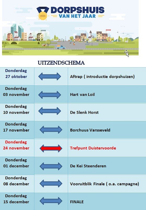 Angelique Krüger doet voor Omroep Gelderland wederom verslag van de wedstrijd en gaat langs bij de vijf finalisten. Tijdens acht afleveringen gaan de genomineerden de strijd met elkaar aan. De eerste aflevering is vanaf donderdag 27 oktober te zien bij Omroep Gelderland om 17.15uur en wordt daarna ieder uur herhaald. Alle finalisten krijgen 750 euro. Het winnende dorpshuis krijgt daar bovenop nog 2.500 euro én de titel ‘Dorpshuis van het Jaar 2022’.