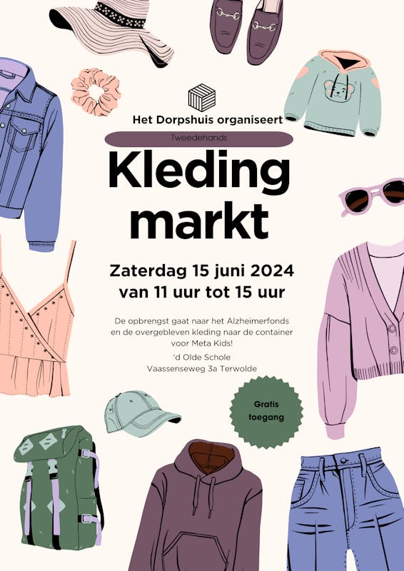 Op zaterdag 15 juni wordt in het Dorpshuis d’Olde Schole in Terwolde een gezellige tweedehands kledingmarkt georganiseerd. Kom snuffelen voor een kek nieuw jasje, een fleurig overhemd of toffe sneakers voor een klein prijsje. De opbrengst van de verkoop van de kleding gaat naar het Alzheimerfonds. De markt is geopend van 11.00 tot 15.00. Uiteraard wordt de inwendige mens niet vergeten!