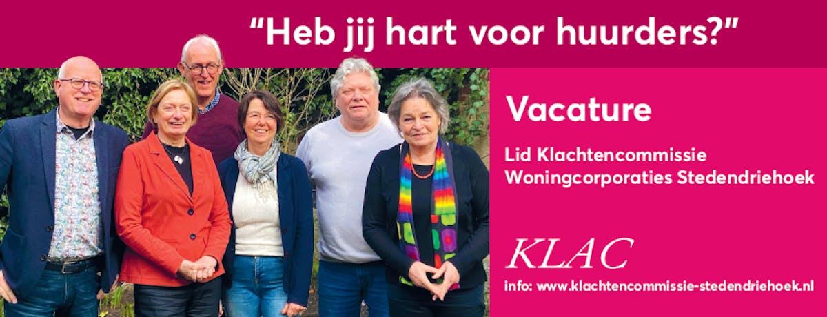 Ben jij maatschappelijk betrokken en heb je kennis van en affiniteit met Volkshuisvesting? Wil je huurders helpen bij het oplossen van klachten? De Klachtencommissie Woningcorporaties Stedendriehoek (KLAC) zoekt een nieuw lid (op voorspraak van de huurdersorganisaties).