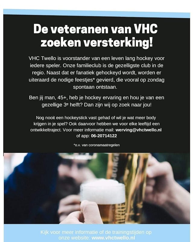 Goed nieuws! De leukste en gezelligste hockeyclub in de regio is op zoek naar heren voor ons veteranenteam!