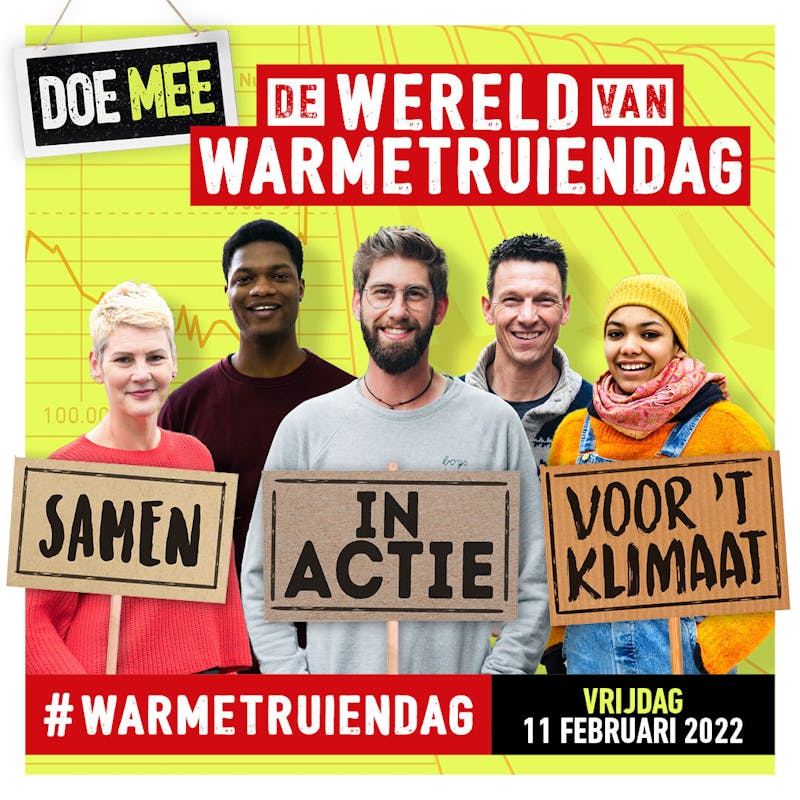 Elk jaar gaan we met het Klimaatverbond Nederland energieverspilling te lijf. Dit doen we met de grootste klimaatactie van Nederland: de Warmetruiendag! Samen bieden we een feest van klimaatoplossingen voor iedereen. Zet 'm alvast in uw agenda: dit jaar vieren we op vrijdag 11 februari 2022 alweer de 16e Warmetruiendag.