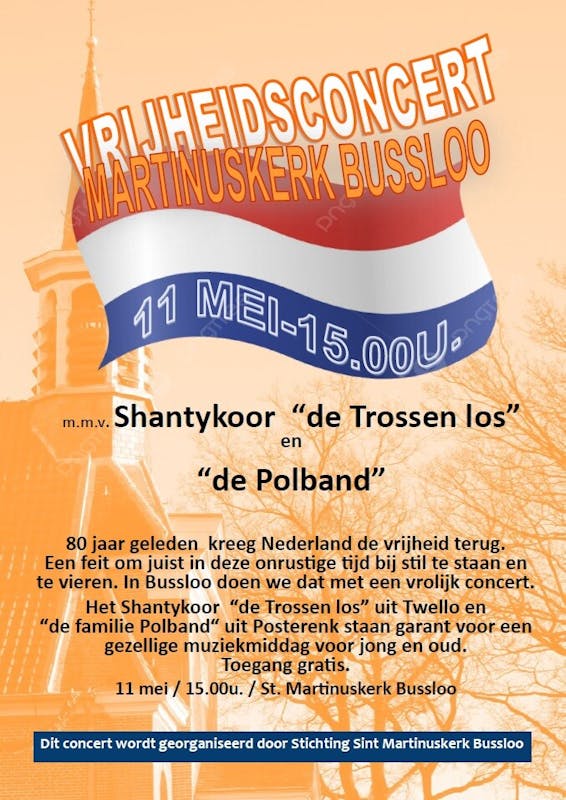 Ook Bussloo viert 80 jaar vrijheid. Dat doen we met een vrolijk, luchtig “Vrijheidsconcert”. Het Shantykoor “de Trossen Los” zorgt voor de vrolijke noot, zodat heel Bussloo het kan horen en mee kan deinen. De Polfamilie-leden, samen de Polband, zorgen met hun muziek voor een beetje weemoed en herinnering door het brengen van be-kende, oude muzieknummers en daarmee voor de balans die middag. Hoewel de serieuze kant van werkelijke Vrijheid in het hier en nu niet weg te denken is en dit concert juist voor bewustwording ervan staat, is elk moment van aandacht voor vrijheid, tachtig jaar geleden bevochten door onze bevrij-ders, een belangrijke. Iedereen voor wie dat telt is welkom bij dit concert.