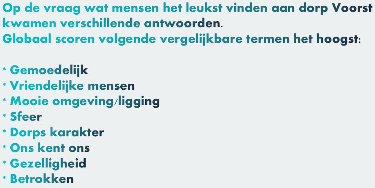 We behaalden een responsscore van 18,65% van het totale inwoneraantal van dorp Voorst en bijbehorende kernen, op de enquête 'Dorp Voorst leeft!'. Wij zijn daar erg blij mee. Dit betekent een goede betrokkenheid onder inwoners van dorp Voorst en omgeving. Op de kerstmarkt d.d. 17 december 2023 hebben wij de resultaten met iedereen gedeeld. Verder zullen wij zo nu en dan uitslagen rondom de sociale vragen met jullie delen middels dit platform.