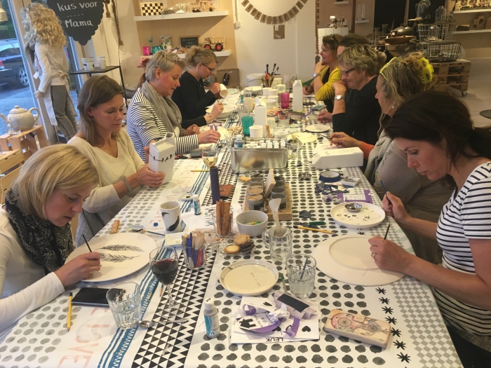 Je kan dan aanschuiven bij onze werktafel en daar krijg je onder begeleiding de kans om je eigen servies te decoreren. Echt creatief hoef je niet eens te zijn. Je krijgt genoeg tips en inspiratie aangereikt om iets moois te maken. Ook geschikt voor kinderen.