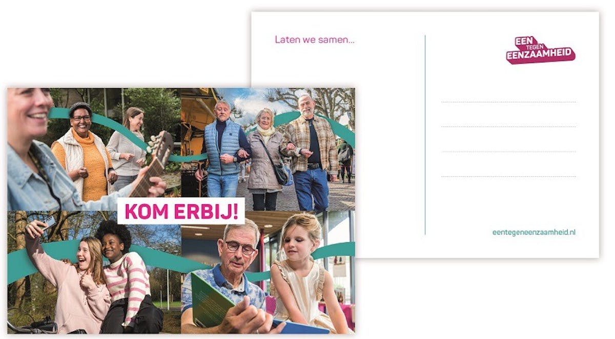 Voor activiteiten is er het (gratis) ‘Kom erbij-pakket’ met aankledings- en informatiemiddelen: placemats, ansichtkaarten, gesprekskaartjes, badges, poster, vloersticker. Je kunt deze kosteloos bestellen. De producten zijn in een herkenbare Week tegen Eenzaamheid-stijl.