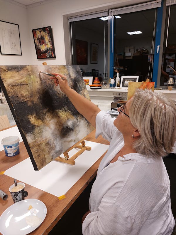 Voor iedereen die abstract en vrij wil leren schilderen. Schilder ervaring is niet noodzakelijk interesse in het abstracte des te meer. De cursus bestaat uit 7 wekelijkse lessen van 2 uur. Er zijn groepen op woensdagochtend (10.00-12.00) woensdagavond (19.30-21.30) en donderdagochtend (10.00-12.00) Het schildersseizoen start in september en is verdeeld in 5 blokken. Blok 2 start vanaf woensdag 30 oktober.
