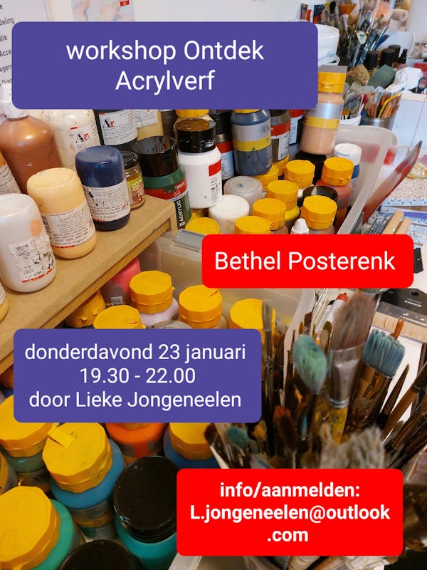 Creatieve workshops in het Bethel gebouw in Posterenk. Hou je van creatief bezig zijn in een gezellige en gemoedelijke setting lekker dicht bij huis? Lieke Jongeneelen (docent tekenen/textiele werkvormen) gaat 23 januari (19.30-22.00) van start met een divers aanbod van creatieve workshops in het Bethel gebouw in Posterenk. Iedere avond staat een specifieke techniek of onderwerp centraal. Voor deelname is geen ervaring nodig, de workshops zijn zo opgebouwd dat iedereen mee kan doen. Thema van de 1e avond is ‘Ontdek acrylverf’. Wat zijn de eigenschappen en hoe werk je hiermee? Je gaat aan de slag met penselen, paletmessen en andere alternatieve gereedschappen en ontdekt wat je aan acrylverf kan toevoegen om extra structuur aan de verf te geven. Ontdekken en experimenteren staat deze avond centraal.