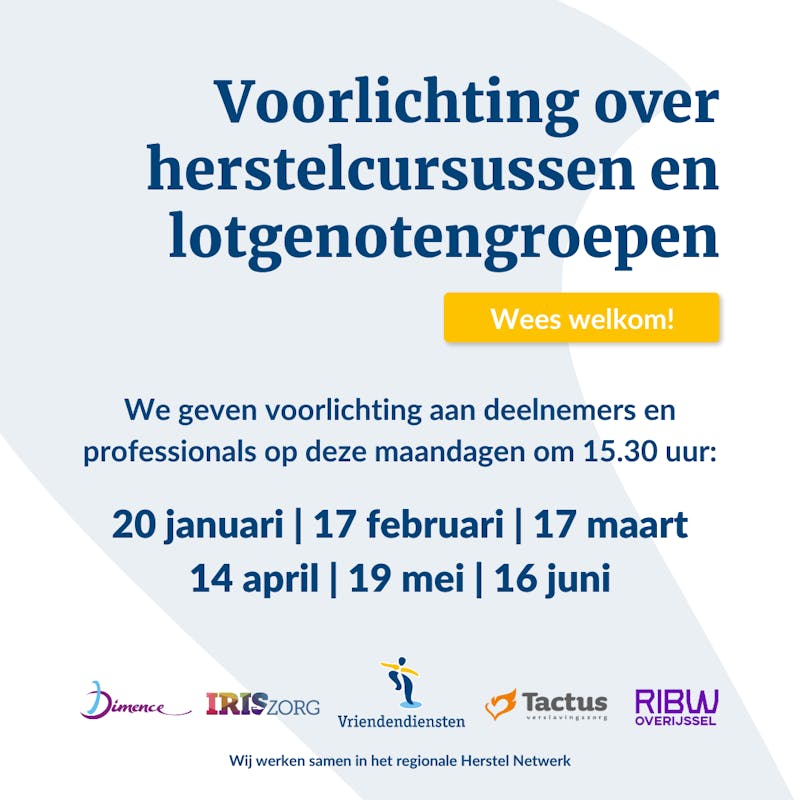 Onze herstelcursussen en lotgenotengroepen gaan niet over 'genezing'. Maar over het ontdekken van mogelijkheden voor een vervullend leven met een psychische kwetsbaarheid. Door contact te hebben met lotgenoten en ervaringsdeskundigen ervaren mensen steun, herkenning, erkenning en hoop. Deze herstelcursussen en lotgenotengroepen worden gegeven door (gediplomeerde) ervaringsdeskundigen van Dimence, IrisZorg, Vriendendiensten, Tactus en RIBW Overijssel. Mensen uit gemeenten Deventer, Olst-Wijhe, Raalte, Lochem en Voorst kunnen hier kosteloos aan deelnemen.