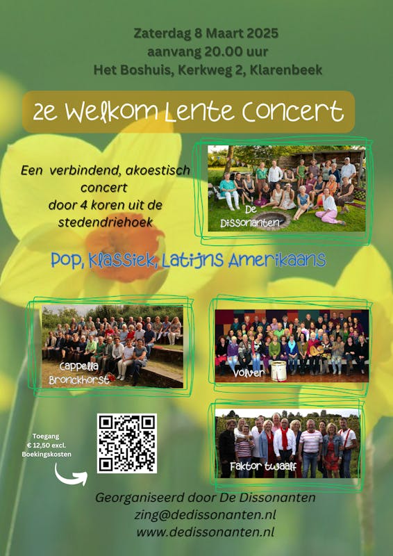 Het Welkom Lenteconcert is een initiatief van De Dissonanten uit Voorst. Vorig jaar organiseerde zij het eerste Welkom Lenteconcert in Klarenbeek Dit was zo’n succes dat zij ook dit jaar weer een concert organiseren. Deze keer met twee nieuwe koren zodat de bezoekers een nieuw repertoire te horen krijgen. Een greep uit het repertoire voor dit jaar is Songoro Cosongo (Cubaans), Bohemian Rapsody van Queen, O Happy Eyes van Edward Elgar, en Suspicious Mind van Elvis Presley.