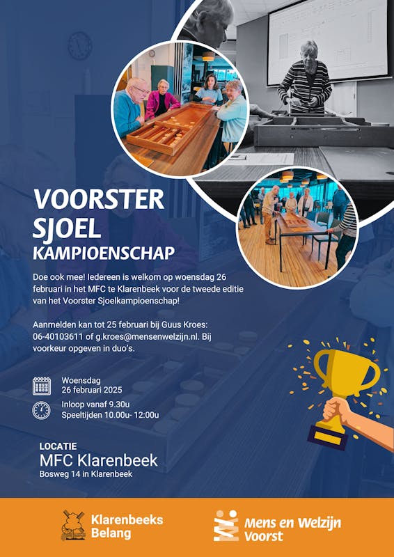 Op woensdag 26 februari 2025 vindt de tweede editie van de Voorster Sjoelkampioenschappen plaats in het MFC te Klarenbeek. “Net als verleden jaar is iedereen welkom en gaat het vooral om de gezelligheid”, benadrukt de organisatie die in handen is van de plaatselijke dorpscontactpersoon en Mens en Welzijn Voorst. Deelnemers kunnen zich aanmelden in duo’s.