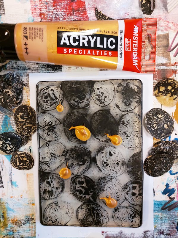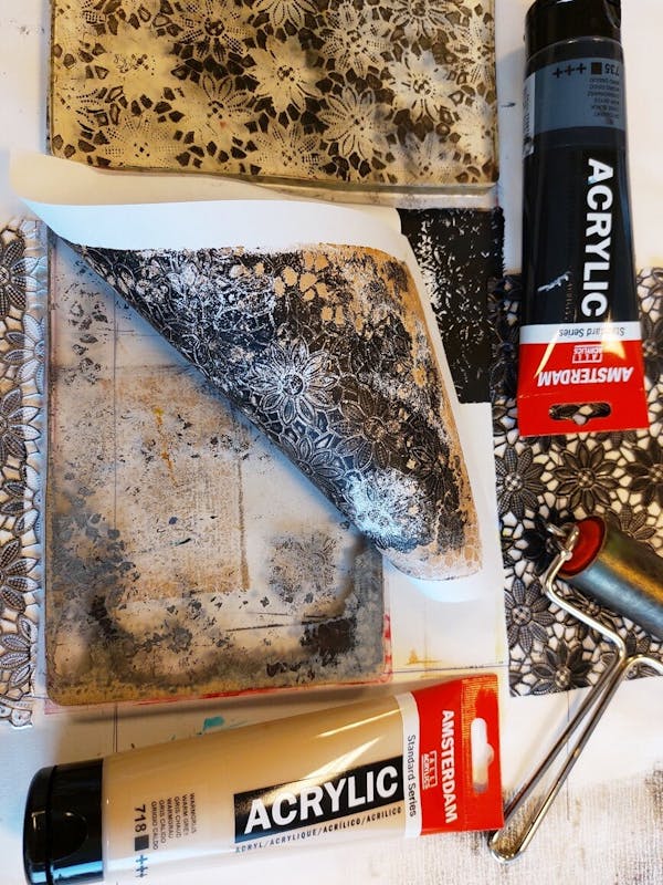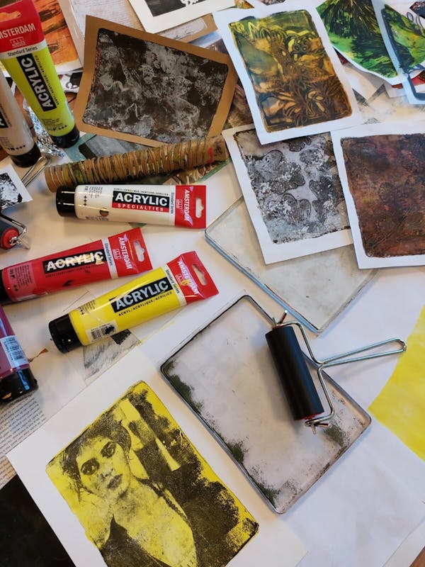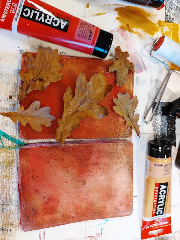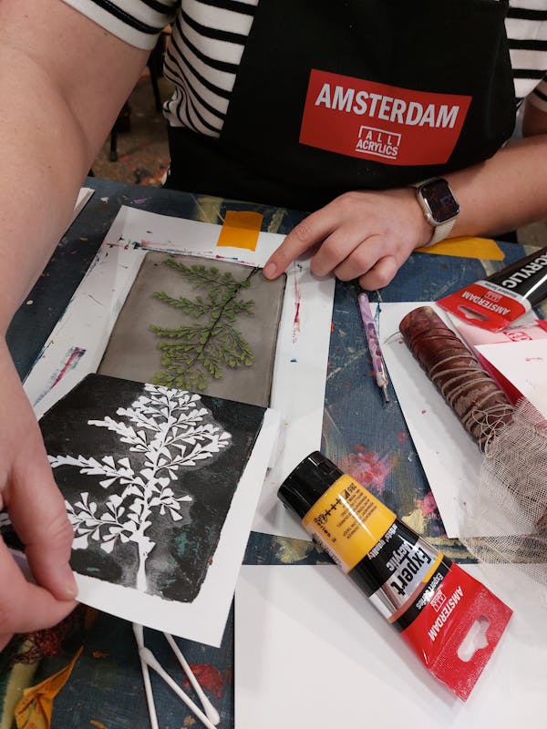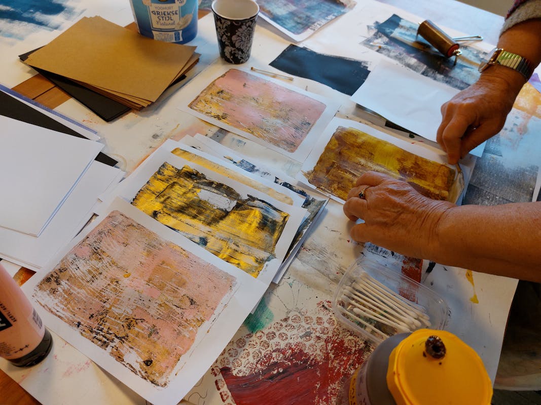 Met de Gelli Plate kan je op een eenvoudige en leuke creatieve manier monotypes (éénmalige afdrukken) maken met acrylverf op papier. Drukinkt of een drukpers zijn niet nodig. De Gelli Plate is heel zacht en heeft een gevoelig oppervlak waardoor je er heel goed allerlei structuren mee kunt afdrukken en is verkrijgbaar in allerlei maten en vormen. Met de Gelli Plate is heel veel mogelijk. Door verschillende afdrukken over elkaar te stapelen ontstaat een prachtig effect. Je kunt de afdrukken natuurlijk gelijk in een lijstje stoppen, maar bv ook gebruiken als achtergrond voor je Art Journal of als collage materiaal verwerken in een schilderij. Geef je creativiteit een boost en doe mee aan deze leuke workshop en leer de basis van het maken van monotypes met de Gelli Plate. Je leert hoe je met verschillende materialen kunt werken zoals gedroogde bladeren en (zelfgemaakte) sjablonen maar ook hoe je een interessante compositie opbouwt in kleur, vorm en textuur.