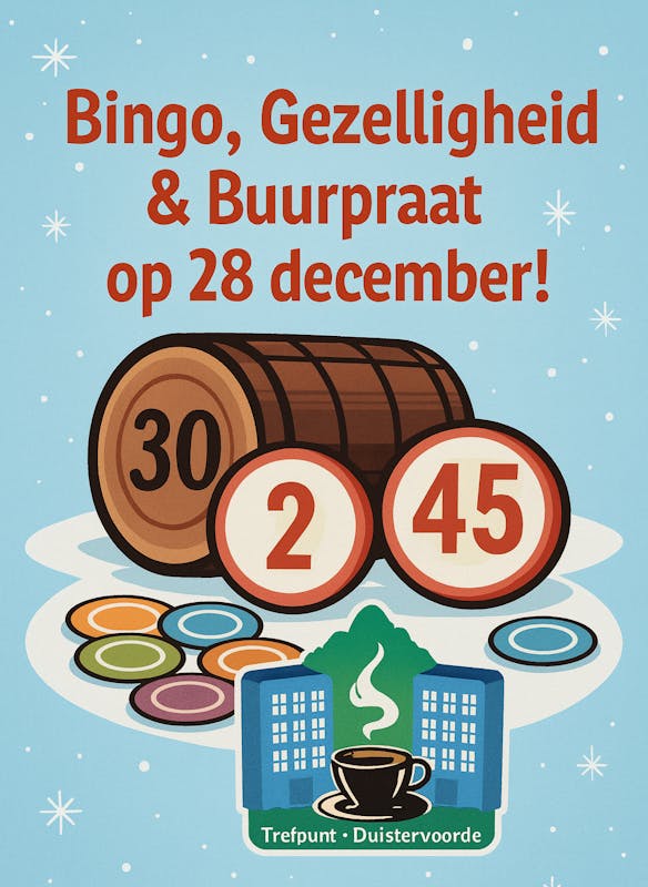 Zondag 28 december sluiten we het jaar af zoals het hoort: met onze Oudejaarsbingo bij Trefpunt Duistervoorde!