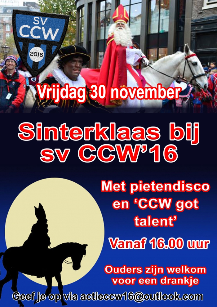 Het duurt niet lang meer of Sint en zijn pieten zijn weer in het land. Sinterklaas heeft ons al laten weten om dit jaar een kijkje te komen nemen op ons prachtig nieuwe sportcomplex om daar samen met alle kinderen en ouders een feestje te komen vieren! Dit wil hij graag doen op 30 november. Hij zou het heel erg leuk vinden als er kindjes zijn die voor de Sint op willen treden, dit mag alleen, maar ook samen met vriendjes en vriendinnetjes. Kortom een heus CCW’16 got talent!
