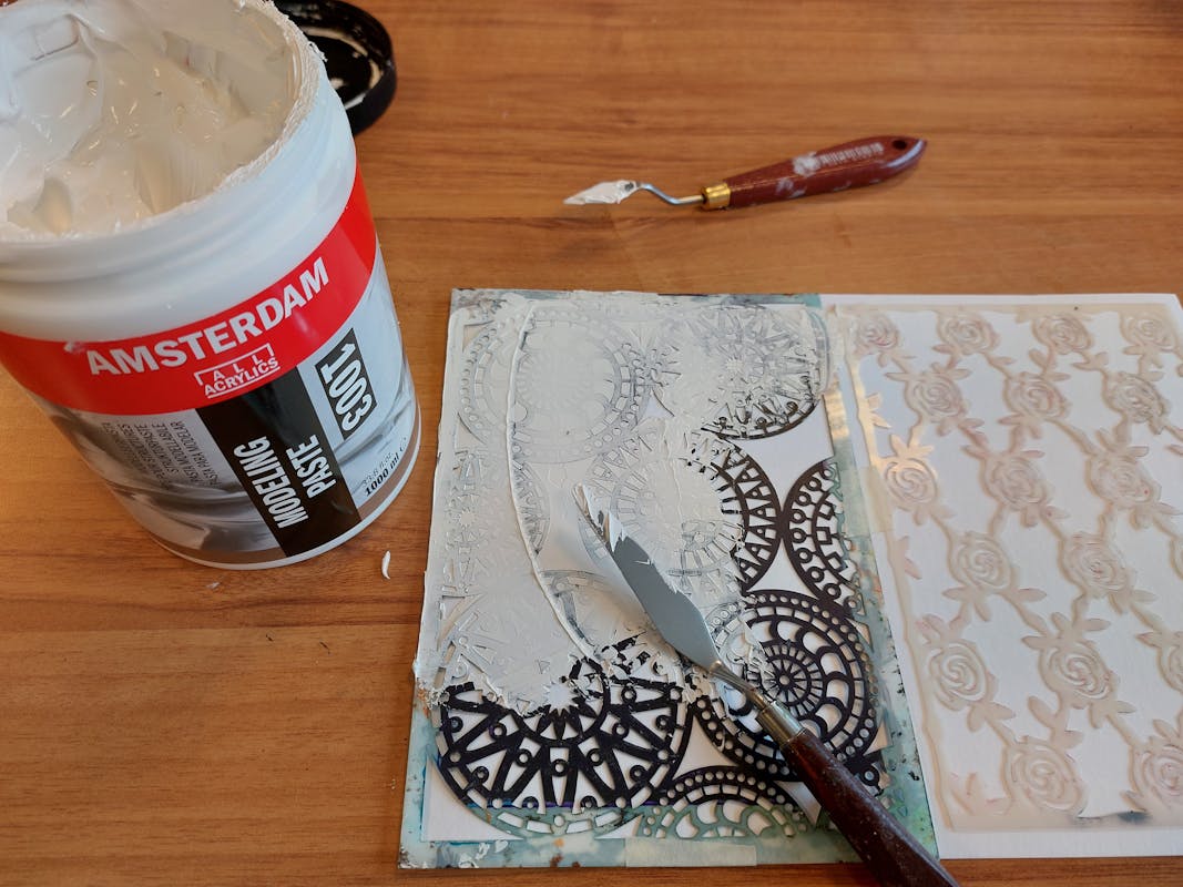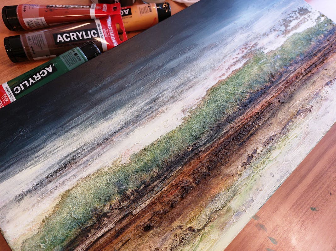 De eerste avond ontdek je verschillende structuur pasta’s en gel mediums van Amsterdam en leer je hoe je hiermee de prachtigste structuren en texturen kunt maken. Ook leer je materie als zand en steentjes toe te voegen waardoor je de structuren nog meer versterkt. Je gaat eerst heerlijk experimenteren met deze veelzijdige materialen en maakt een aantal opzetjes op verschillende ondergronden zoals papier en doek. Omdat het droogproces langer duurt dan bij verf is het niet mogelijk dezelfde dag nog te starten met schilderen.