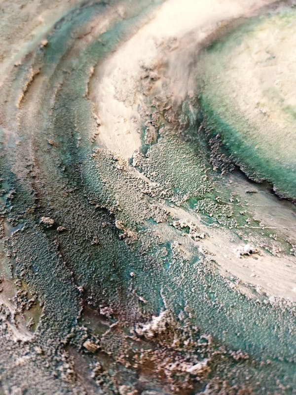 De 2e avond ga je de structuren die nu mooi opgedroogd zijn beschilderen met acrylverf. Je leert verschillende technieken om het schilderen op structuren aan te pakken. Door de verf komen alle kleine details in de structuren pas echt goed tot hun recht en gaat het leven. Je zal verrast zijn van het resultaat! Structuren als deze lenen zich goed voor organische vormen, kleuren en sferen.